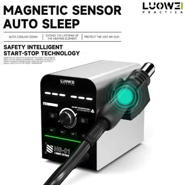 - Safety intelligent, start-stop technology, when the hot air gun is placed on the stand, the magnetic, switch in the handle automatically triggers the device to enter a cooling standby mode: when the gun is lifted, it quickly heats up to the preset temperature