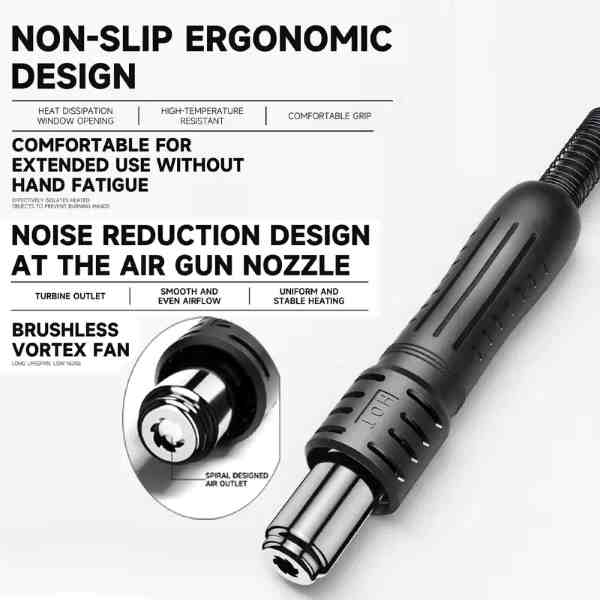 - Noise reduction design at the air gun nozzle, turbine outlet, smooth and even airflow, uniform and stable heating, brushless vortex fan, long lifespan, low noise